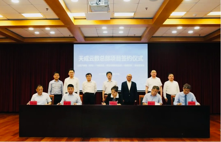 2022年6月22日下午,華勝天成與青島市南區政府、山東產業技術研究院(青島)、春峰里資本、青島海諾投資發展有限公司五方在青島市南區政府舉行了華勝天成“天成云數總部項目”戰略合作簽約儀式。青島市南區委書記王鋒、區委常委/辦公室主任孫健、副區長管偉、華勝天成董事長王維航、華勝天成總裁申龍哲、華勝天成高級副總裁翟鑫、山東產業技術研究院院長孫殿義、春峰里資本董事長/青島數智產業特區CEO石克清、青島海諾投資發展有限公司董事長馬曉力等領導出席了本次簽約儀式。