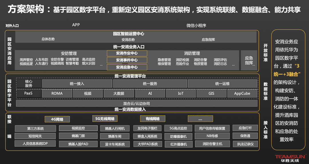 傳統(tǒng)園區(qū)面臨設(shè)施基礎(chǔ)薄弱、系統(tǒng)孤立、高度依賴“人防”的現(xiàn)狀,亟需利用科技手段提升園區(qū)信息化數(shù)字化建設(shè)水平。基于智慧園區(qū)所面臨的挑戰(zhàn)及行業(yè)發(fā)展趨勢(shì),華勝天成集團(tuán)副總裁張穎女士分享了華勝天成園區(qū)安消一體化方案。方案依托華為園區(qū)數(shù)字平臺(tái),通過(guò)“三統(tǒng)一”(統(tǒng)一安消業(yè)務(wù)入口、統(tǒng)一安消管理平臺(tái)、統(tǒng)一數(shù)據(jù)接入)和“三融合”(業(yè)務(wù)融合、平臺(tái)融合、數(shù)據(jù)融合),構(gòu)建安防、消防一體化建設(shè)標(biāo)準(zhǔn),打造了園區(qū)安消一體化方案,提升制造園區(qū)的安消應(yīng)急處置效率。