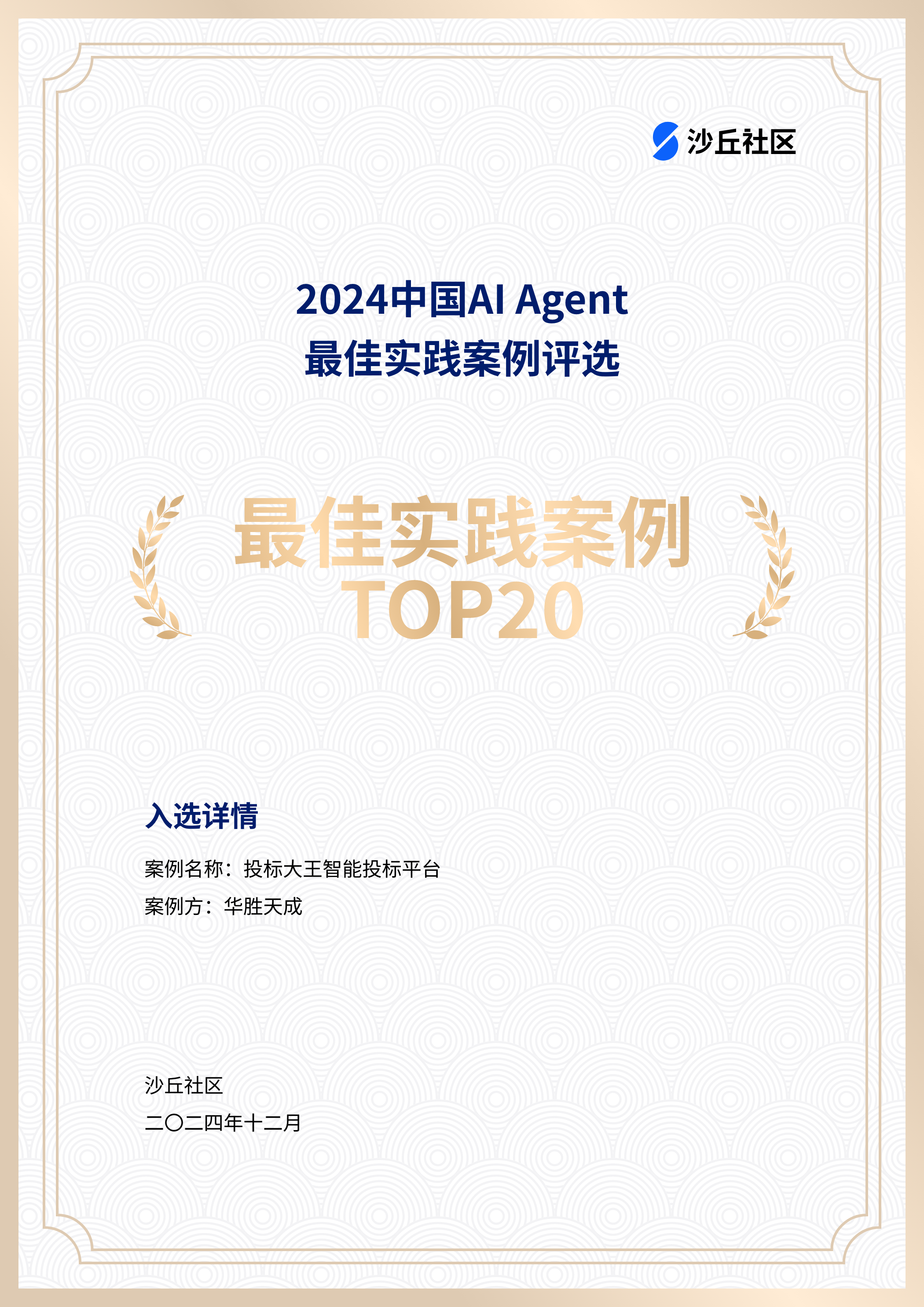 近日,華勝天成自主研發的AI驅動智能投標系統“投標大王”榮登《2024中國AI Agent最佳實踐案例TOP20》榜單。該榜單聚焦金融、通信、醫療、能源、互聯網等行業的優秀AI Agent應用,展現了技術從概念到實踐的跨越式發展。此次投標大王入選,不僅彰顯了華勝天成在大模型技術應用領域的卓越實力,也體現了公司以技術驅動行業變革的使命與擔當,成為行業智能化發展的重要推動者。