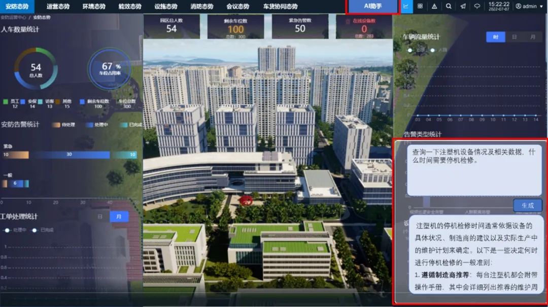 在傳統園區中,能源管理與設備運維高度依賴人工經驗。華勝天成結合華為數字平臺的數據服務,通過融合DeepSeek大模型的時序預測與優化算法,系統可實時分析氣象、人流、設備狀態等數據,動態調整空調溫度、照明亮度及充電樁功率。某制造園區試點顯示,接入AI模型后月度綜合能耗降低18%,年碳排放減少超1500噸。