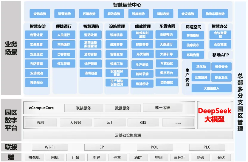 在AI技術開源化趨勢加速的背景下,華勝天成基于對智慧園區場景的深度理解,選擇采用DeepSeek開源大模型作為技術基座,通過自主訓練與垂直領域優化,構建專屬場景化AI能力。公司技術團隊圍繞園區管理痛點,結合華為數字平臺,完成了大模型從通用能力到產業知識的定向增強,實現了三大核心場景的價值重構:
