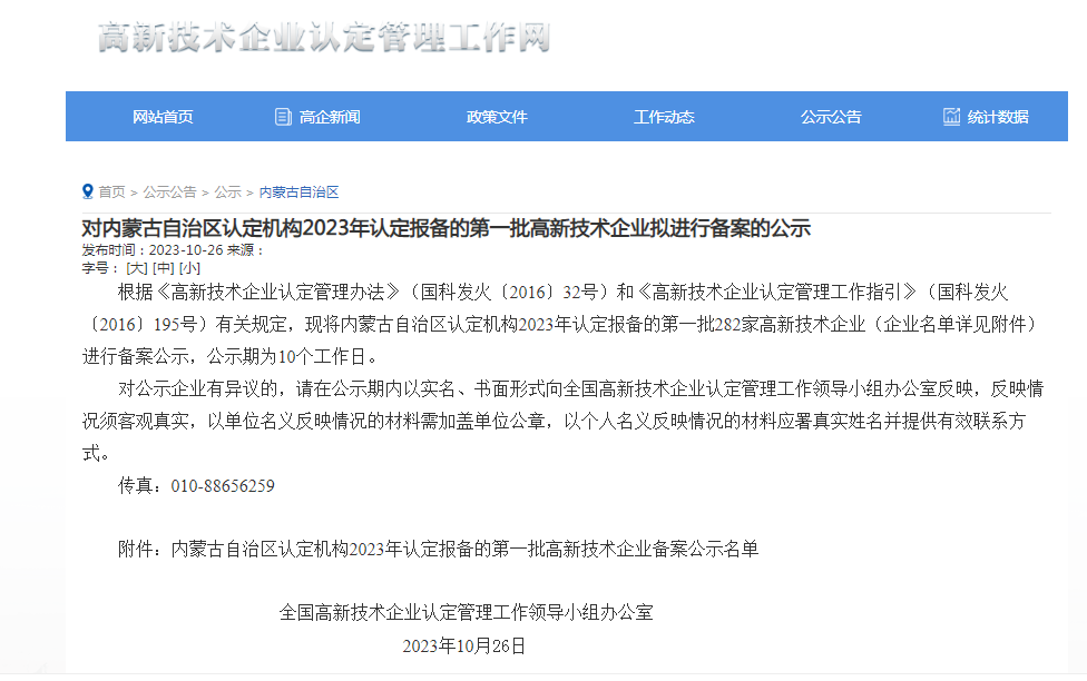 10月26日,根據(jù)《高新技術企業(yè)認定管理辦法》(國科發(fā)火〔2016〕32號)和《高新技術企業(yè)認定管理工作指引》(國科發(fā)火〔2016〕195號)有關規(guī)定,對內蒙古自治區(qū)認定機構2023年認定的第一批282家高新技術企業(yè)進行公示,內蒙古佰惠生新農業(yè)科技股份有限公司位列其中。