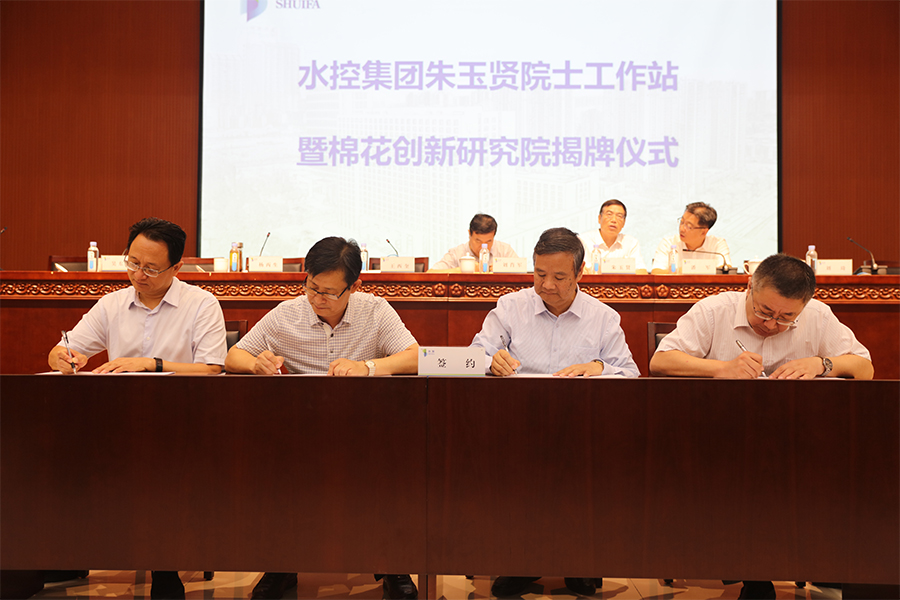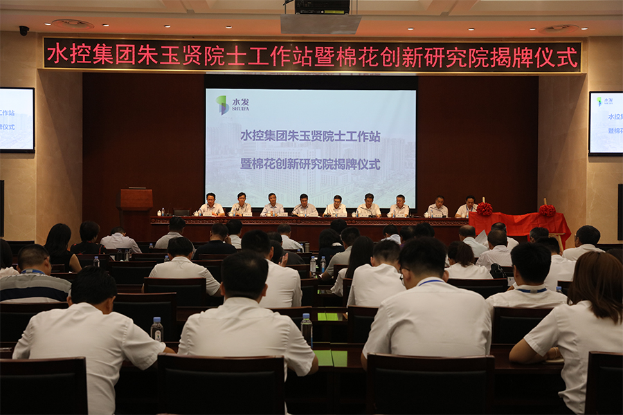 隨后,朱玉賢、潘軍、劉肖軍、吳東振、王西奎、劉琦、楊丙生一同為水控集團(tuán)朱玉賢院士工作站和棉花創(chuàng)新研究院揭牌。