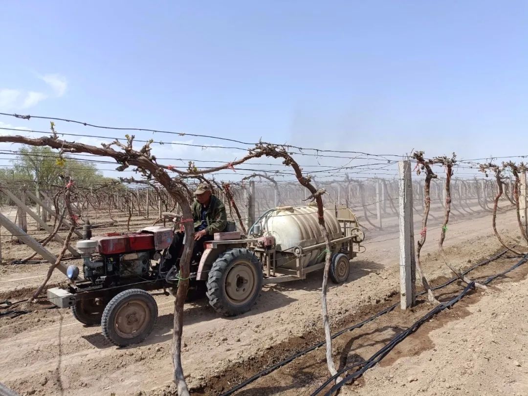 雙河水發(fā)北疆果蔬公司五師雙河市葡萄產(chǎn)業(yè)現(xiàn)代農(nóng)業(yè)示范區(qū)的技術(shù)員仍然戰(zhàn)斗在生產(chǎn)一線,為了確保180畝流轉(zhuǎn)葡萄地的苗木出土后的正常生長(zhǎng),按照公司制定綠色葡萄生產(chǎn)標(biāo)準(zhǔn)化管理規(guī)程相關(guān)要求,公司羅平、何興華等生產(chǎn)技術(shù)人員在調(diào)配農(nóng)藥殺菌劑,采用機(jī)械化的霧化噴施,對(duì)已出土的葡萄苗木開展病蟲害集中消殺清理。